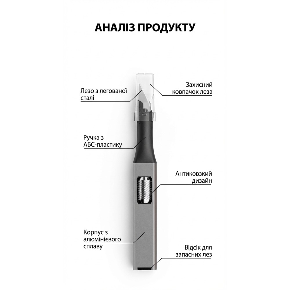 Ідеальний баланс між точністю та безпекою: ергономічна рукоятка забезпечує впевнений контроль, а гострі леза легко справляються з найскладнішими завданнями обробки 3D-моделей