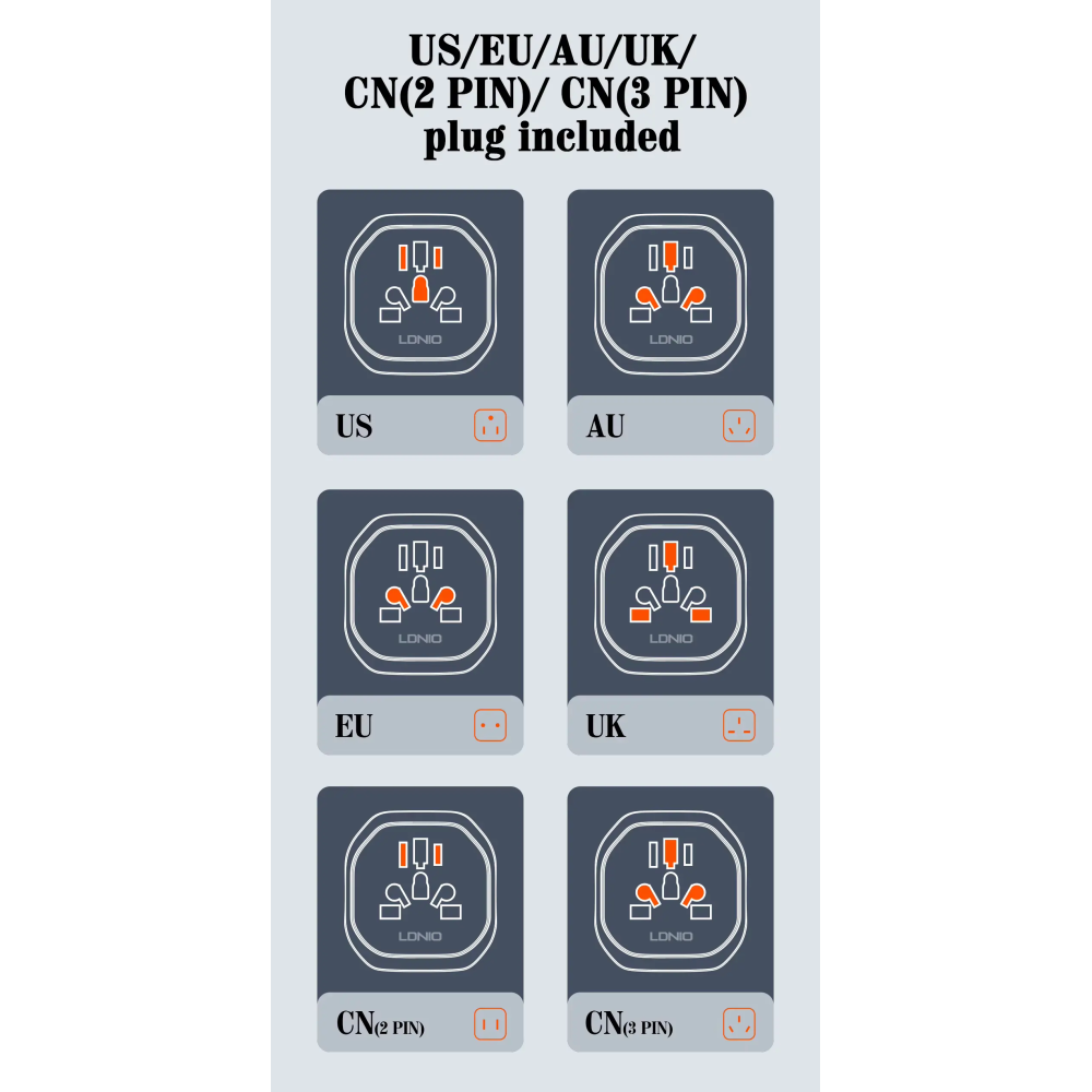 LDNIO Z7 має універсальний дизайн, що дозволяє використовувати його з різними стандартами розеток по всьому світу. Більше не потрібно турбуватись про придбання окремих перехідників для кожної країни. Один адаптер — безмежні можливості!