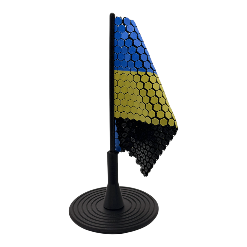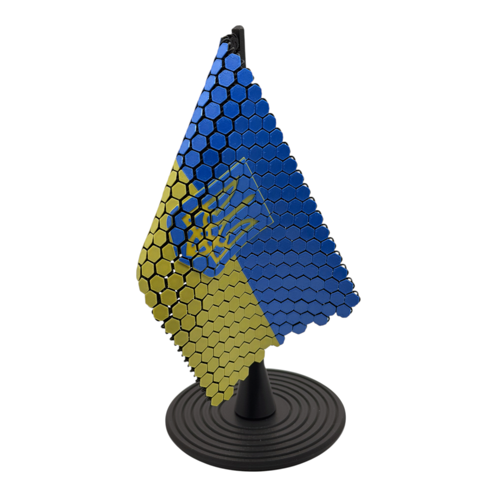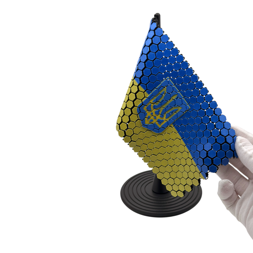 Символ несокрушимости, который всегда рядом. Этот настольный флаг Украины – стильный патриотический аксессуар для рабочего стола, полки или зоны рецепции. Изготовленный методом 3D-печати , он имеет выразительную фактуру в виде "сот" и рельефный трезубец, который придает объем и премиальный вид. Лаконичная черная стойка и широкое основание делают конструкцию устойчивой и уместной в современном интерьере.